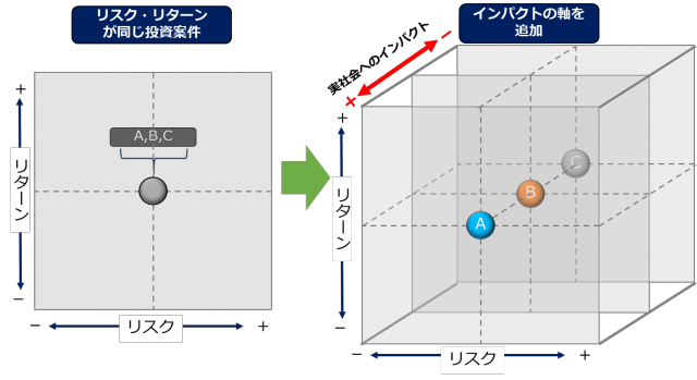 従来の金融判断は将来の不確実性を考慮した「リスク(Risk)」と、期待される金銭的な「リターン(Return)」の2軸を中心に行われてきました。しかしPIFでは、これに「インパクト(Impact)」という第3の軸を明示的に加えるフレームワークであり、投資の判断や管理をより包括的に捉え直すものです。